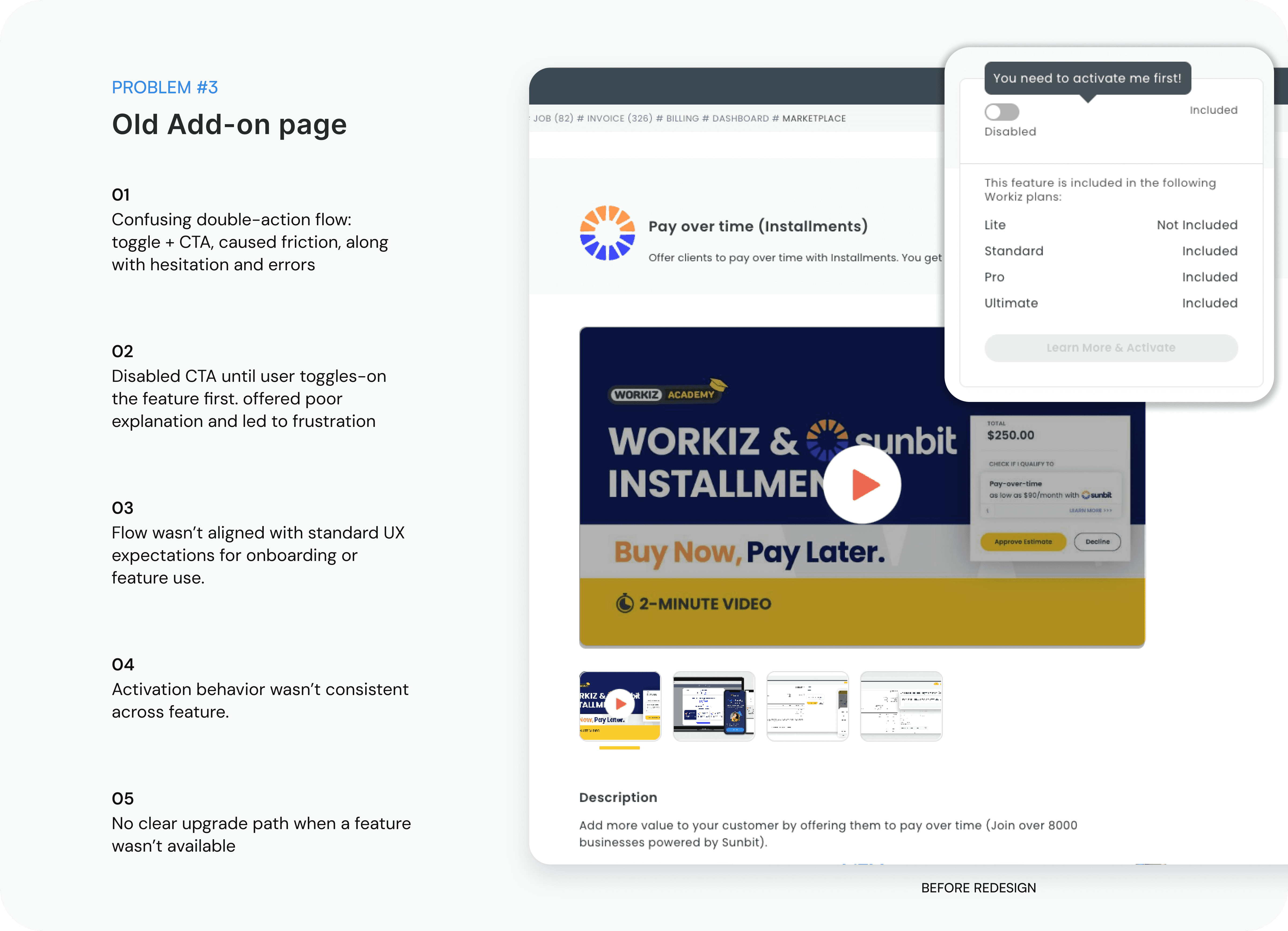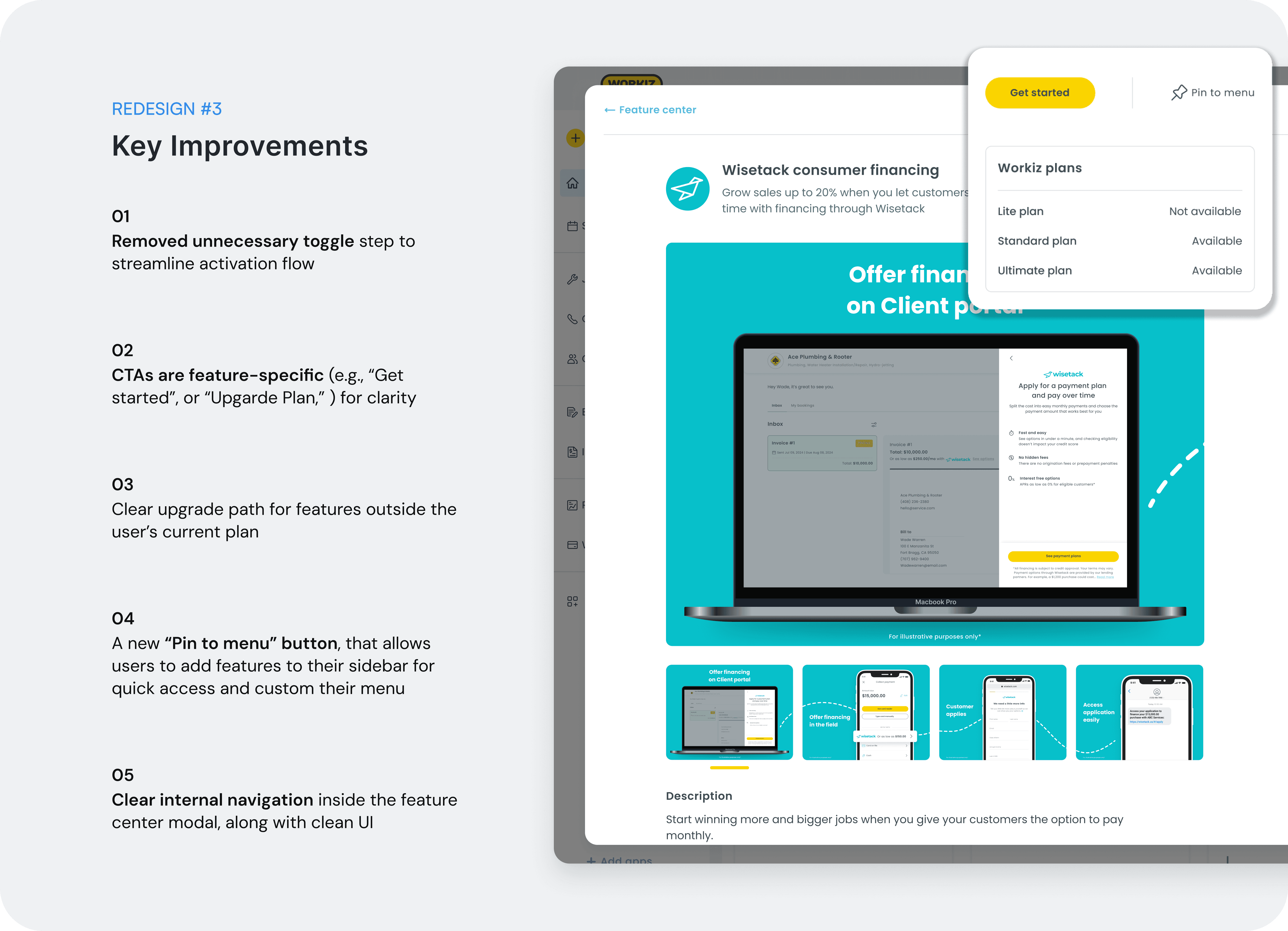 I redesigned the feature page to simplify activation and improve clarity. The new single-button flow eliminates unnecessary toggles, dynamically adapts CTAs based on the user’s plan, and introduces “Pin to Menu,” allowing users to customize their workspace with direct access to key features.