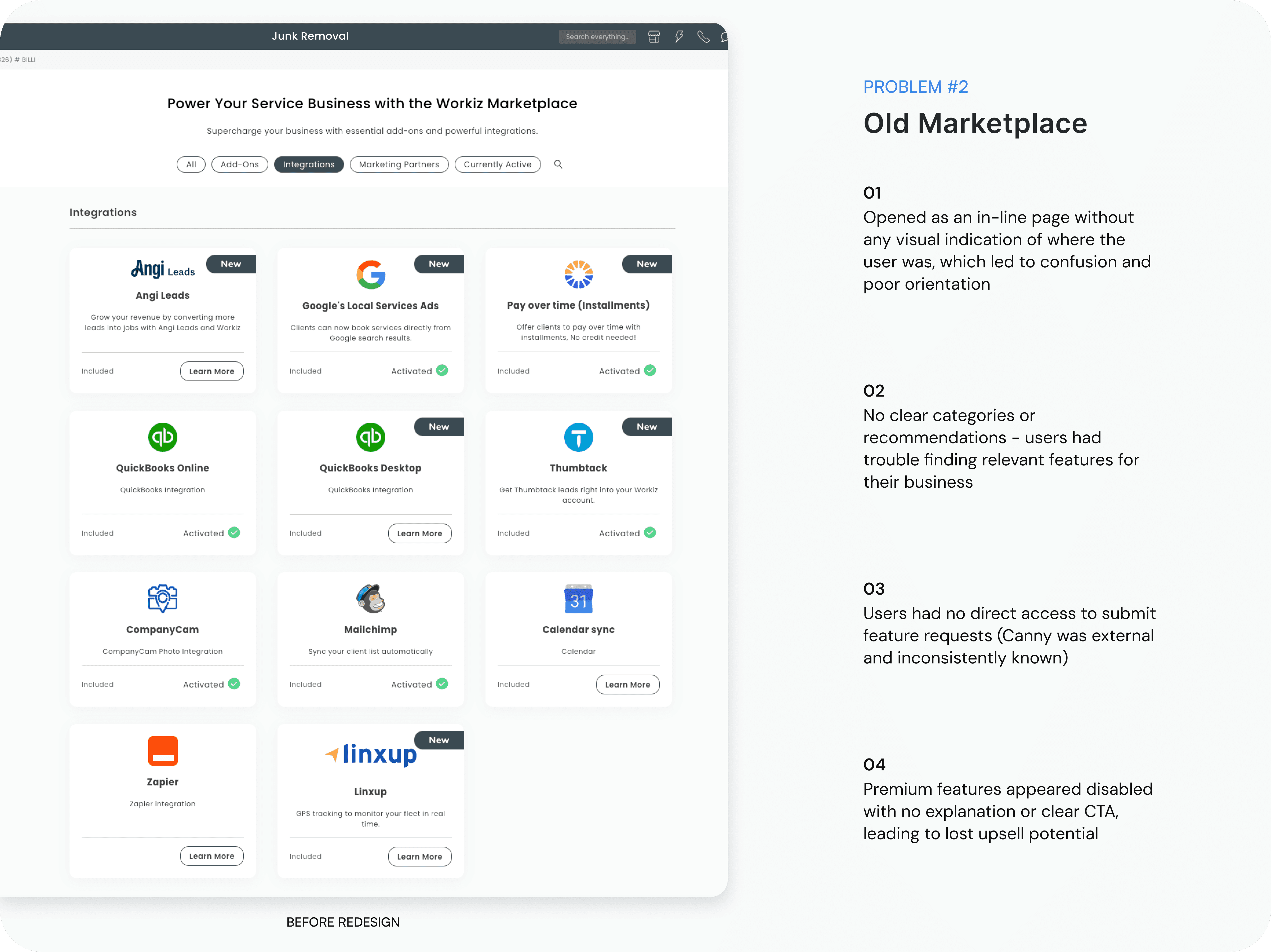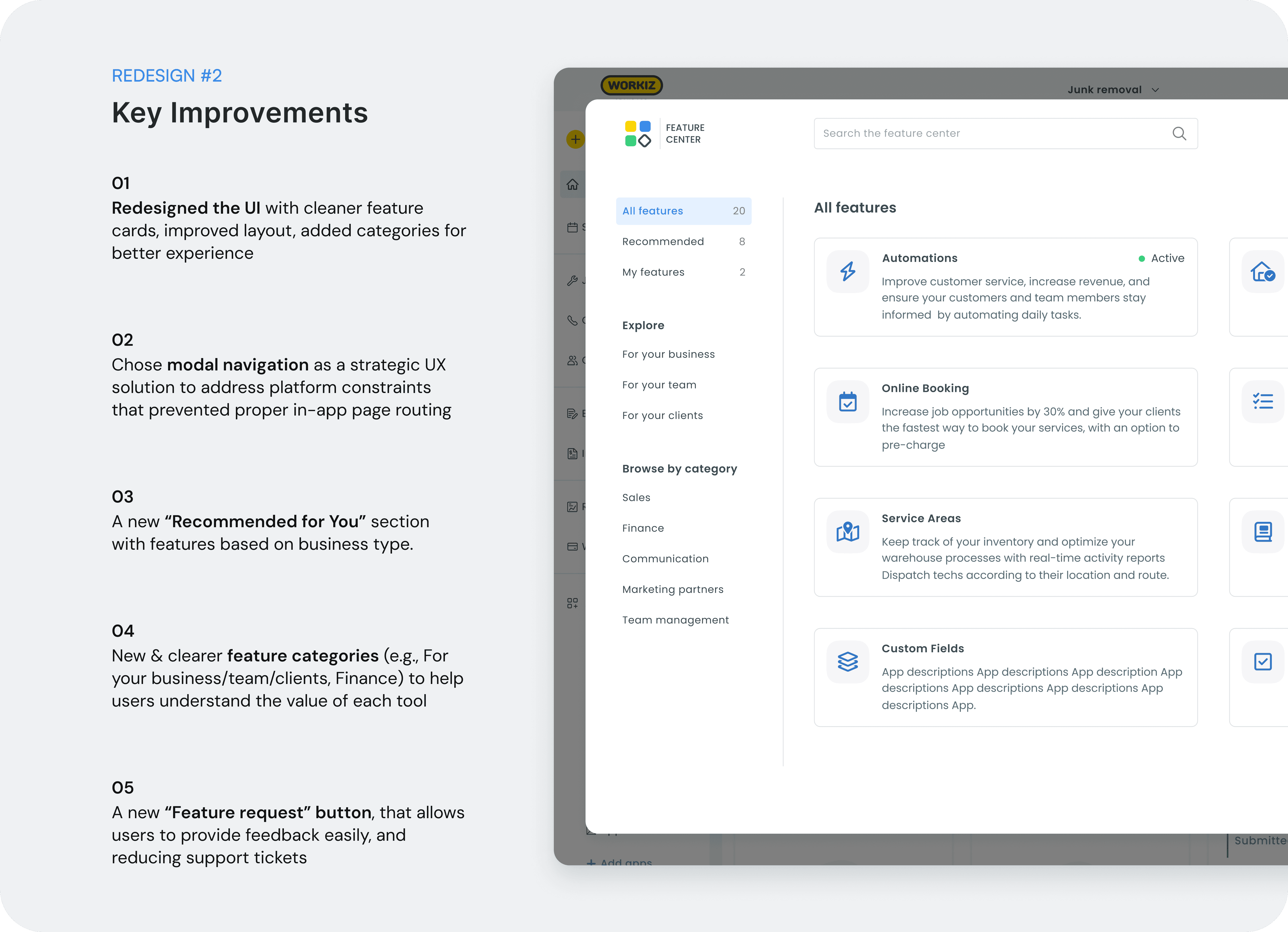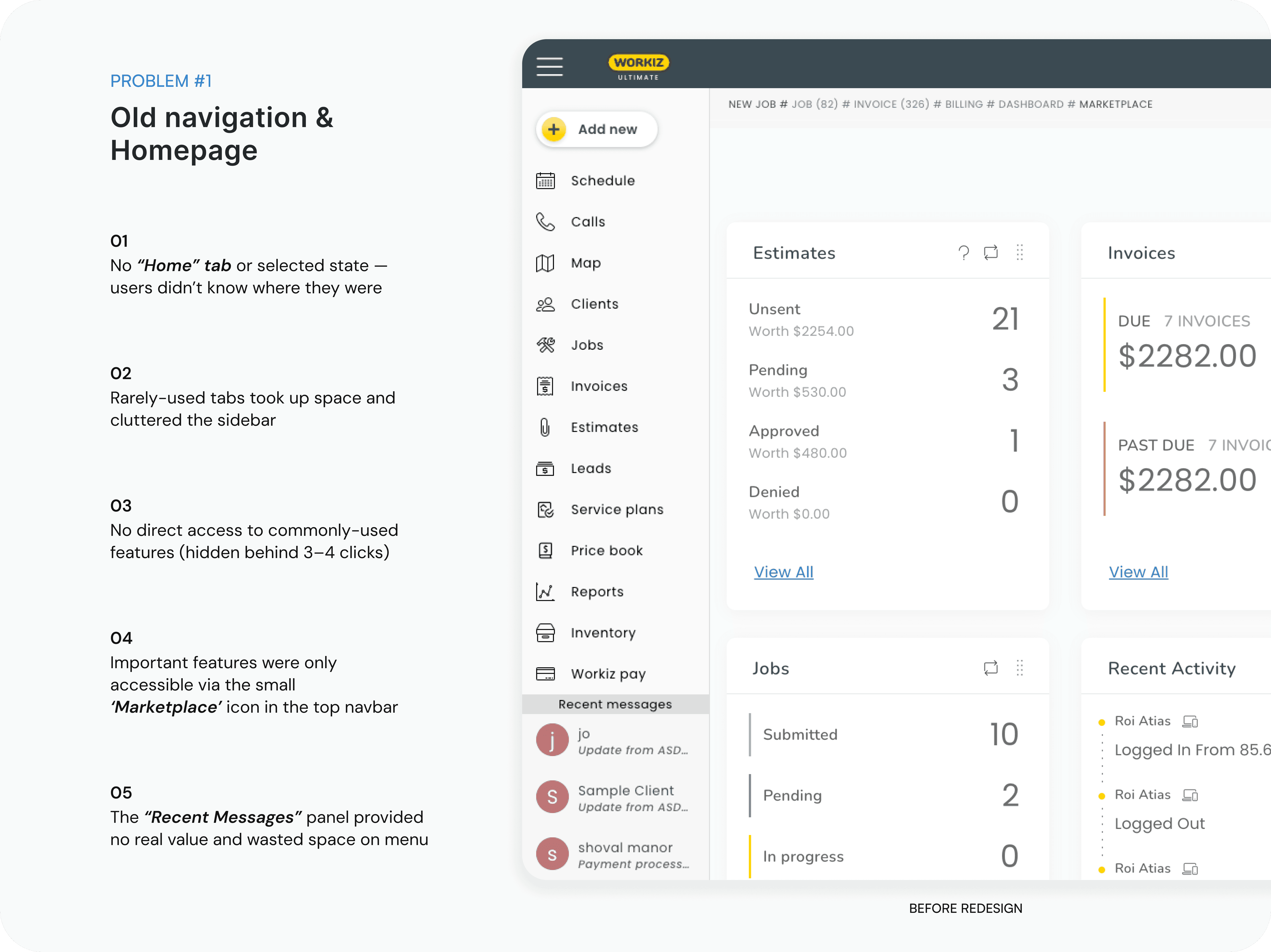 In this project, we redesigned Workiz’s main navigation experience, optimizing the navbar, sidebar, and marketplace to improve discoverability and ease of use. We also introduced new capabilities, such as pinning features to the menu, and incorporated a more intuitive activation flow for features.