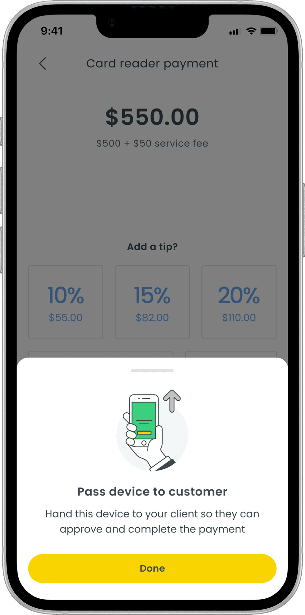 To help technicians adopt the new flow and feel confident using it in front of customers, I added a subtle “Pass device to customer” prompt. This microcopy sets clear expectations and guides technician behavior in real time, preventing awkward moments during payment.