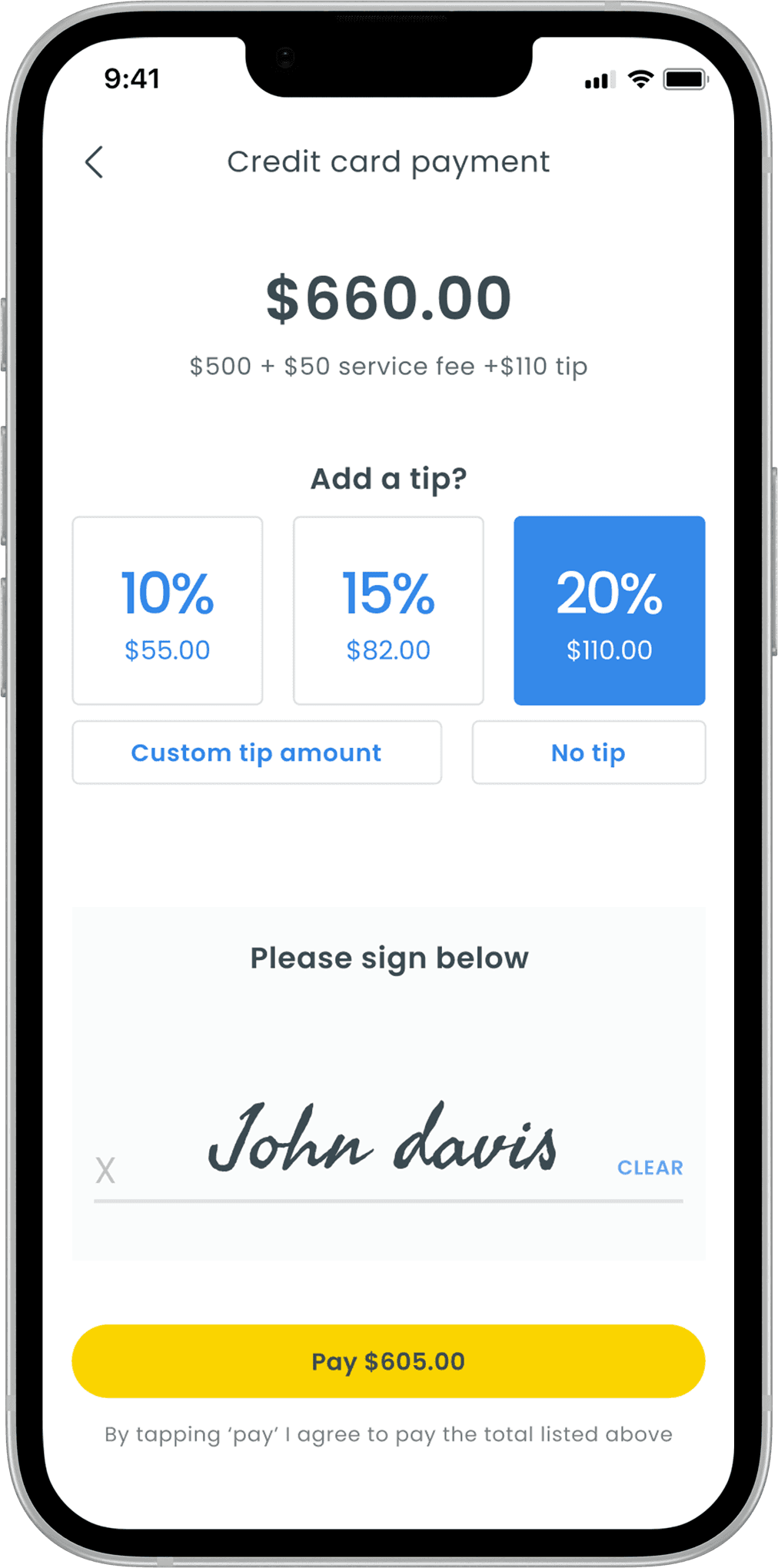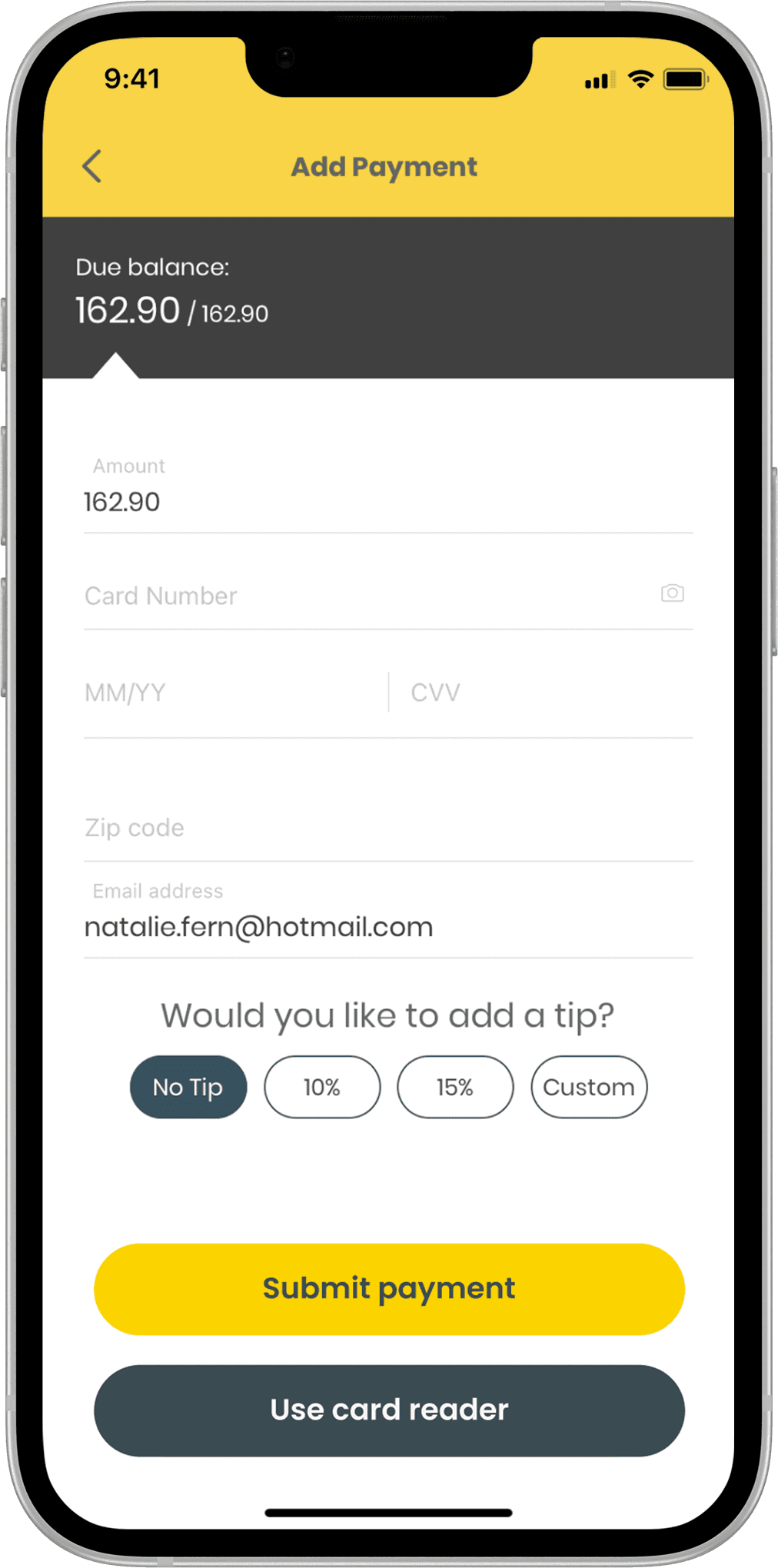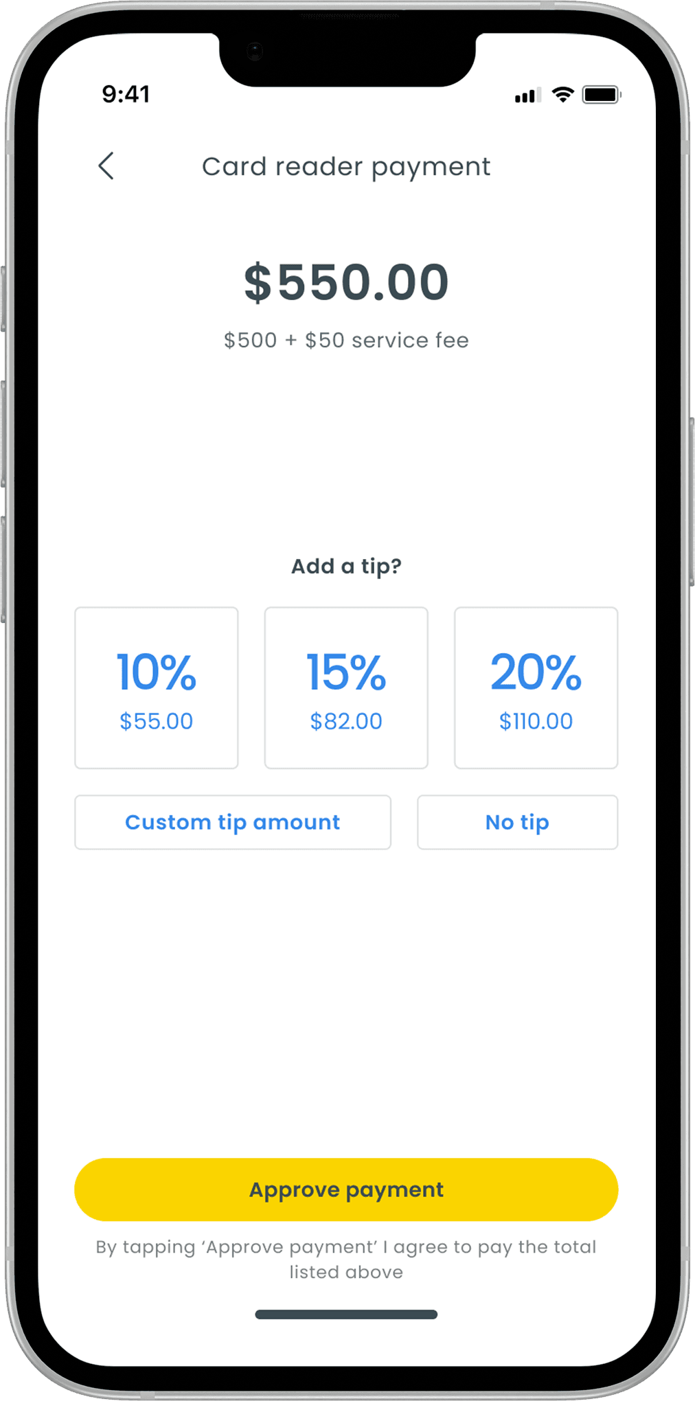 The tipping option was awkwardly presented on the same screen where technicians enter their clients' card details, making it uncomfortable to ask for a tip. and tipping wasn’t integrated into the card reader flow.