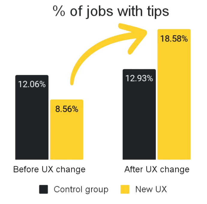 Users who experienced the new payment flow left 2× more tips compared to the old experience and approximately 45% more than the control group-proving the impact of intuitive UX on real business outcomes.